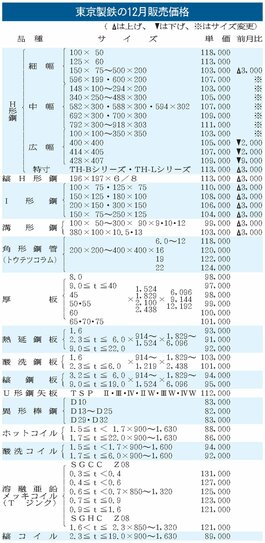 東京製鉄は17日、12月契約の鋼材販売価格について形鋼4品種(H形鋼、縞H形鋼、溝形鋼、I形鋼)を前月比でトン3千円値上げすると発表した。形鋼の値上げは2023年4月契約以来...