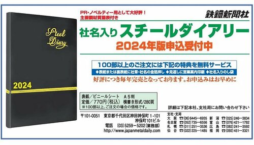 鉄鋼新聞社では『社名入りスチールダイアリー』の2024年版のお申込みを受付中です。