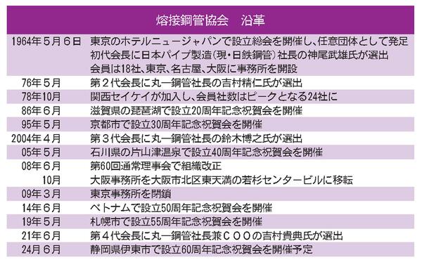 構造用鋼管、電線管など溶接鋼管メーカーで構成する「熔接鋼管協会」は今年、設立60周年を迎えた。鋼管は自動車・建設・電機・農業など多様な需要分野で使用され、日本経済の成長を支えてきた。2021年には吉村貴典氏(丸一鋼管社長兼COO)が第4代会長に就任。吉村会長にこれまでの経緯や現状、そして今後の展望などについて聞いた。(宇尾野宏之)