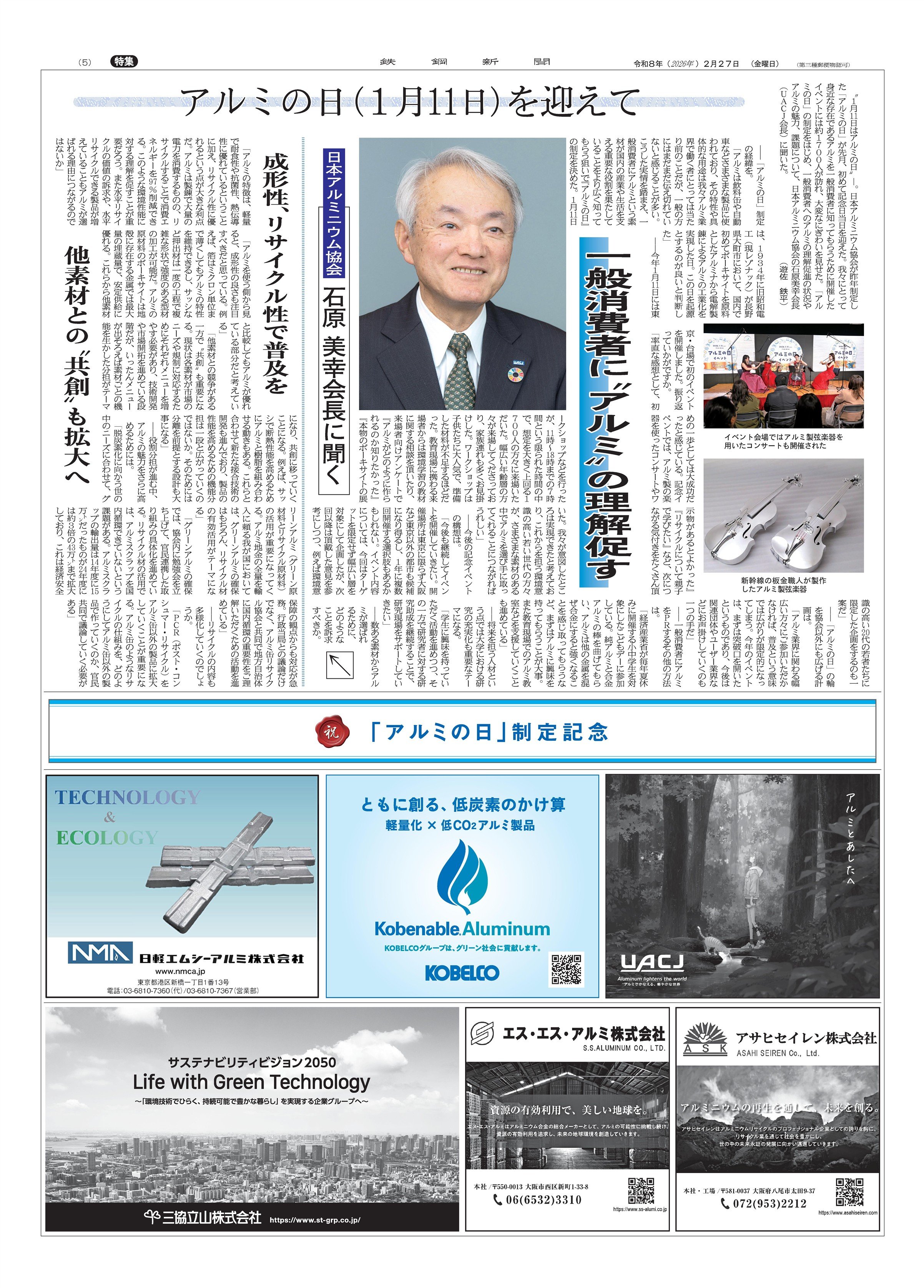 アルミの日(1月11日)を迎えて/日本アルミニウム協会・石原美幸会長に聞く/一般消費者に〝アルミ〟の理解促す/成形性、リサイクル性で普及を/他素材との〝共創〟も拡大へ 2026/2/27 05:00 鉄鋼 アルミの日(1月11日)を迎えて