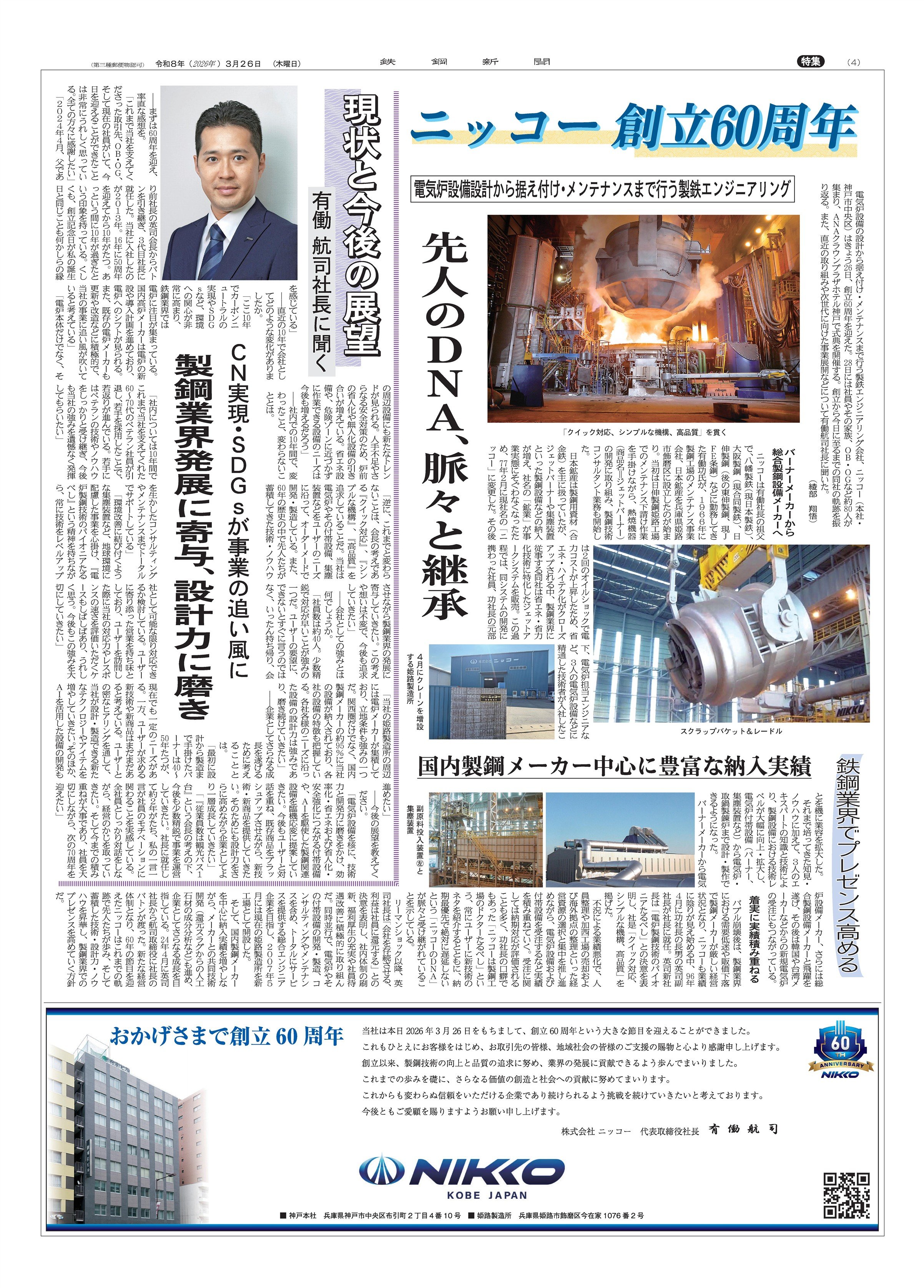 ニッコー創立60周年/電気炉設備設計から据え付け・メンテナンスまで行う製鉄エンジニアリング/先人のDNA、脈々と継承/国内製鋼メーカー中心に豊富な納入実績/鉄鋼業界でプレゼンス高める/ 2026/3/26 05:00 鉄鋼 ニッコー創立60周年 企業・団体の周年特集