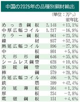 中国の25年品種別鋼材輸出/亜鉛めっき鋼板が2000万トン突破/電磁鋼板、2年連続過去最高