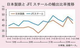 日本製鉄とJFE/7~9月期の鋼材輸出比率/円安進行も数量減・価格下落で低下