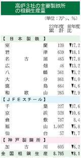 高炉3社/22年度の製鉄所別粗鋼生産/主要拠点が軒並み減少/自動車向けなど需要減で