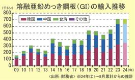 溶融亜鉛めっき鋼板輸入/24年も過去最高レベルへ/前年並み71万トン前後の見込み/中国、韓国からの増加目立つ/15年間で4.5倍、通商措置求める声も
