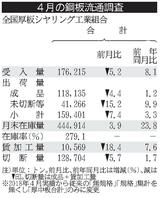 厚板シヤ工組/4月の鋼板流通調査/出荷量、3カ月ぶり前月比減/在庫は漸増、需給も緩和