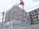 日建リース工業/高層建築連層足場ユニット/埼玉県川口市の複合施設工事で採用/せり上げ作業、クレーン占有時間削減