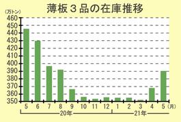 薄板3品在庫が増加/5月末、9カ月ぶり390万トン台/季節要因で需給タイト感続く