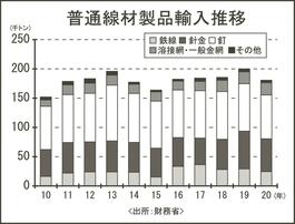 20年の普通線材製品輸入/5年ぶり減の18万トン/釘は7.4万トン、09年以来の低水準