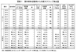 鉄源協会/22年使用済み自動車からの国内鉄スクラップ発生/9.2%減の179万トン/シュレッダー、プレスとも減少/廃車台数、3年連続減の413万台