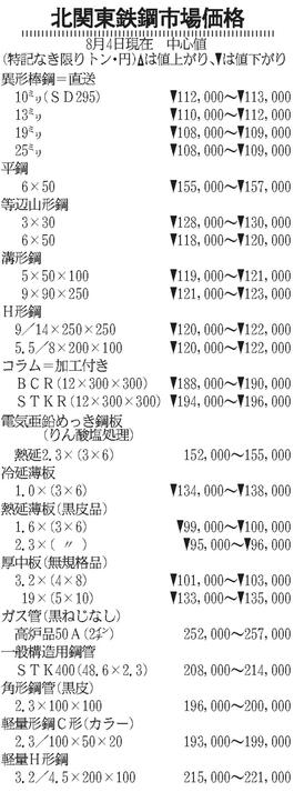 北関東市況/異形棒鋼、形鋼類、コラムが2千円安/冷延・熱延薄板、厚中板も1千~2千円続落