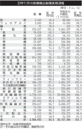 11月品種別鉄鋼輸出/インドへホット8万トン/厚板、10カ月ぶり20万トン割れ