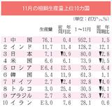 11月の世界粗鋼生産/3%増、1億4550万トン/インドは11%増加