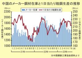 中国の8月上旬鋼材在庫/メーカー、流通とも増加/粗鋼生産は小幅増