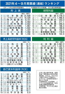 主要鉄鋼50社の業績ランキング/ROS、大和工業が首位/ROEは日本製鉄、7割弱が経常増益/4~9月期/需要回復、価格上昇