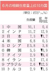 世界粗鋼生産/6月は3カ月連続減、1億5880万トン/中国・インド増、日・韓・EUなど減/1~6月は1%減の9.4億トン