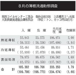 8月の関西地区薄板流通動態/全品種で在庫率上昇/関西CC工業会と大阪鉄流協調査