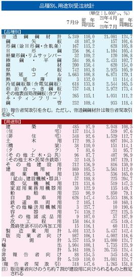 国内向け普通鋼鋼材受注/7月、16%増/5カ月連続増