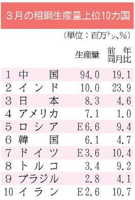 3月の世界粗鋼、8カ月連続増/中国19%増、インド24%増