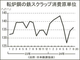 8月の転炉スクラップ消費原単位/前月比2キログラム増、136キログラム/消費量72万3000トン、原単位、量とも2カ月連続増