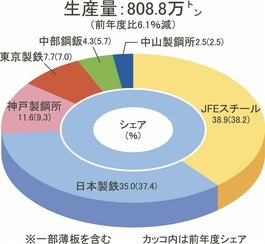 2024年度の鉄鋼生産シェア(5)/厚中板/首位のJFE、小幅上昇/3位の神鋼、11%超に上昇/本紙調査