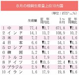 8月の世界粗鋼生産/5カ月ぶり増、1億4530万トン