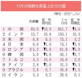 世界粗鋼/11月、3カ月連続減/中国大幅減、印・米は増加