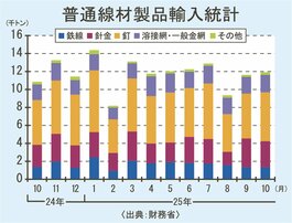 10月普線製品輸入/1割増の1万1916トン/2カ月連続増
