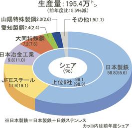 2023年度の鉄鋼生産シェア/11/ステンレス熱延鋼材/首位の日鉄、58%台に上昇/JFE、日本冶金は低下/本紙調査