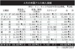 4月の米国アルミ輸入/18%減、41万トン/前月比は19万トン減