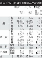伸銅品8月生産量4.6%増/自動車端子・コネクタ向け回復