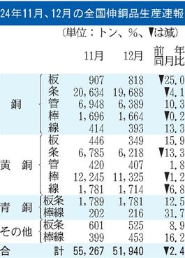 24年12月の伸銅品生産/2.4%減、5万1940トン/自動車端子・コネクタ向け減少