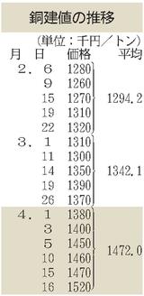 黄銅棒原料購入値/17円上げの1040円/日本伸銅