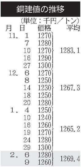 建値/JX金属、銅2万円下げ/三井金属、亜鉛1万5000円下げ
