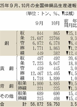 伸銅品の10月生産/3.5%増、5万9750トン/銅条、黄銅板条など6品種増加