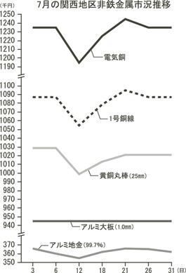 非鉄月間市況/7月/関西地区/銅類、国際相場の高値反映/アルミ地金は横ばい推移
