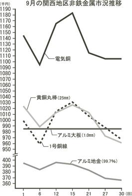 非鉄月間市況/9月/関西地区/電気銅、月央に3カ月ぶり高値/アルミ地金は下旬に急落