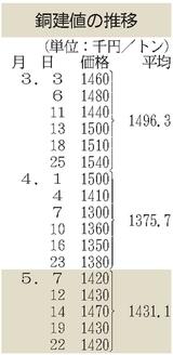 黄銅棒原料購入値/14円下げの986円/日本伸銅
