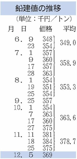 建値/JX金属、銅4万円上げ/三井金属、亜鉛6000円下げ