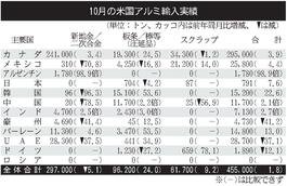 米国の10月アルミ輸入/1.8%増、45万5000トン/2カ月連続増