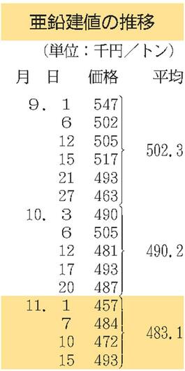 建値/JX金属、銅8万円上げ/三井金属、亜鉛2万7000円上げ