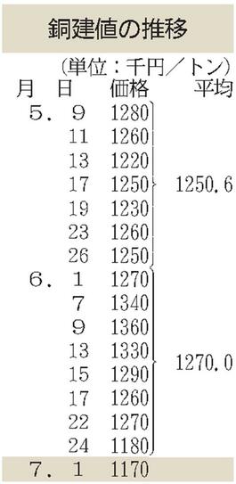 建値/JX金属、銅1万円下げ/三菱マテ、鉛1万2000円下げ/三井金属、亜鉛4万2000円下げ