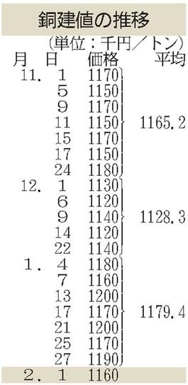建値/JX金属、銅3万円下げ/三菱マテ、鉛1万2000円下げ/三井金属、亜鉛3000円上げ