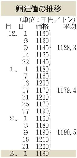 建値/JX金属、銅1万円下げ/三菱マテ、鉛9000円上げ/三井金属、亜鉛9000円上げ