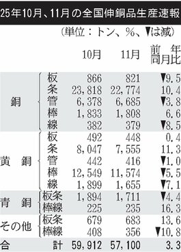 11月の伸銅品生産/3.3%増、5万7100トン/銅条、黄銅板条など6品種増加