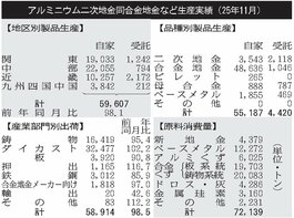 11月のアルミ二次合金生産/1.9%減、5万9607トン/主力のダイカスト向けは増加