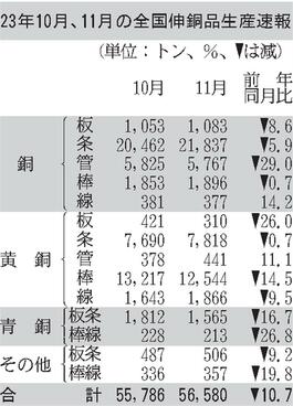 11月の伸銅品生産/11%減、5万6580トン/車向け回復減少幅縮小