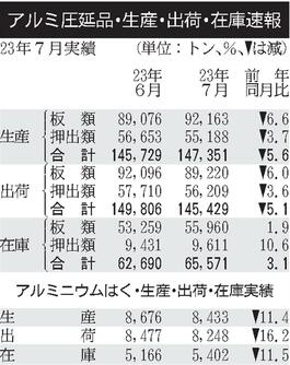 7月のアルミ圧延品出荷/5.1%減、14万5429トン/車向け回復も缶、建材不振