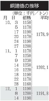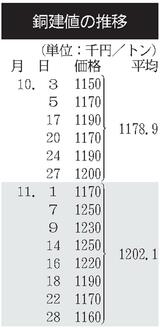 建値/JX金属、銅1万円下げ/三井金属、亜鉛3万9000円下げ