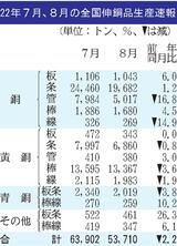 8月の伸銅品生産/2.2%減、5万3710トン/エアコン向け低迷、銅管2割減